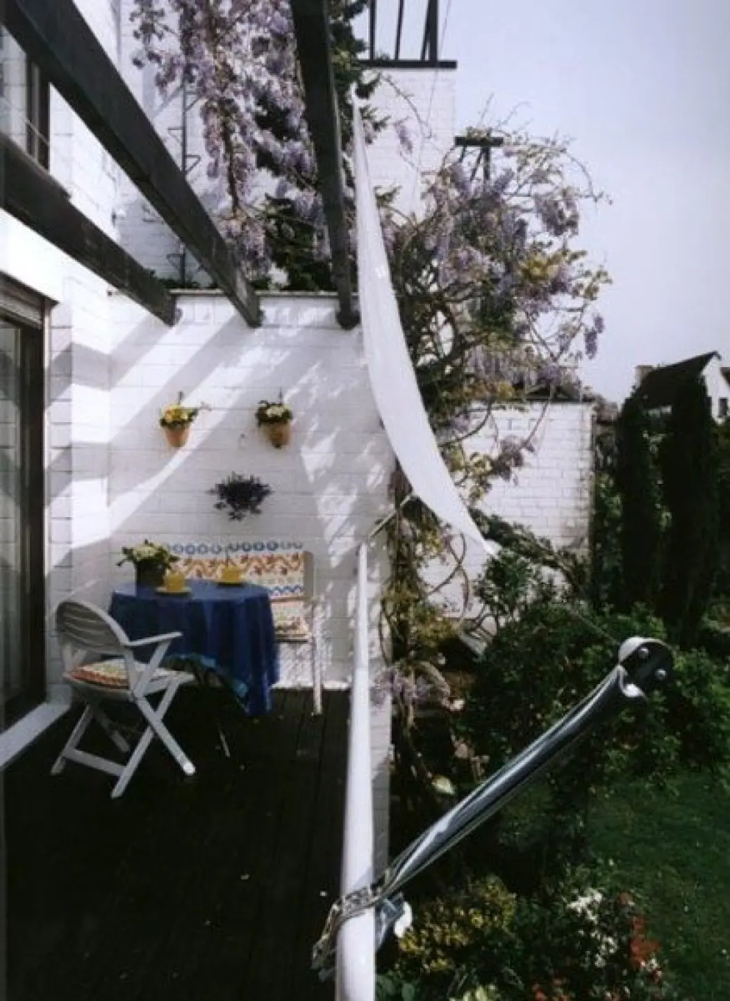 - Sonnensegel H230 x B140 cm oben an einem Spannseil geführt (2 m lang) unten mit Metallösen zum Festbinden am Geländer