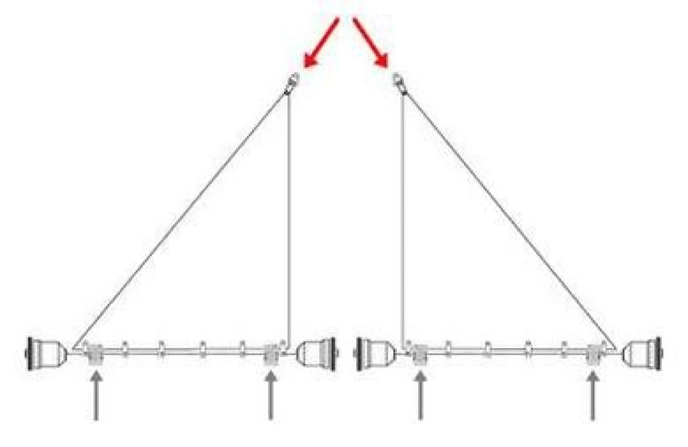 - die lange Seite eines Dreiecksegels wird an einem Edelstahlseil zwischen zwei Abspannsystemen geführt - das Zusammenrutschen der Laufhaken verhindern Sie mit dem Aufstecken der Laufhakenstopper