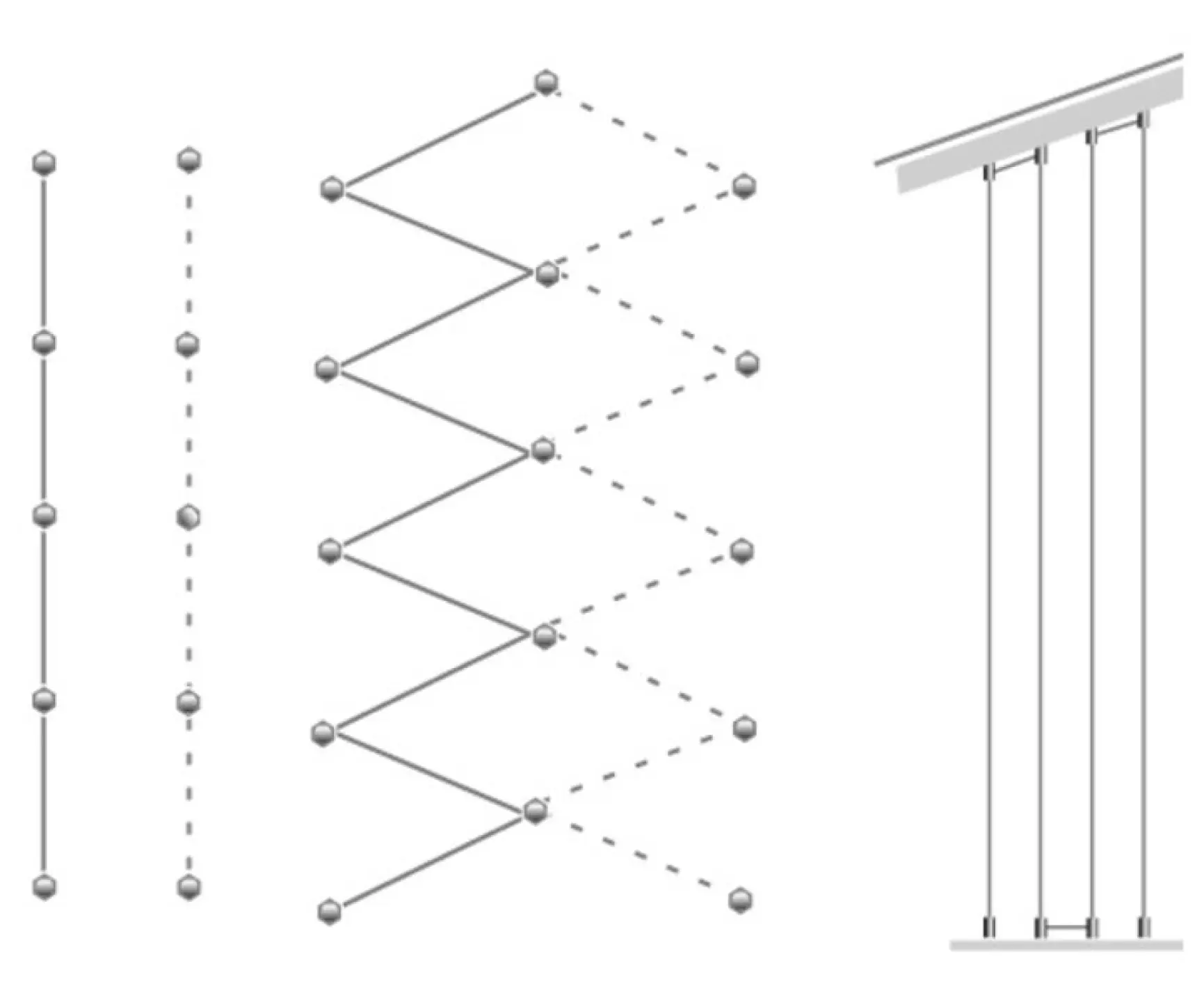 Wir empfehlen die Doppelschrauben in größeren Abständen (ca. 1 m oder mehr) zu montieren und das Edelstahlseil sowohl senkrecht nach oben zu führen, als auch schräg zwischen einer zweiten senkrecht nach oben gesetzten Reihe von Doppelschrauben.