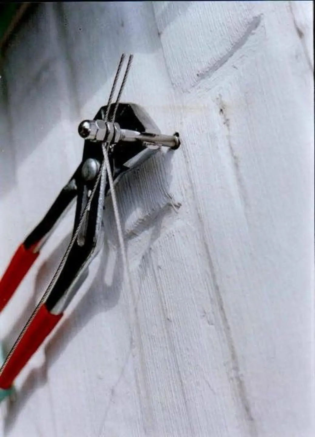 Die Doppelschrauben haben Flachmuttern, zwischen denen Sie das Edelstahlseil klemmen können, ohne es an der scharfen Kante des Schlitzes zu verletzten.