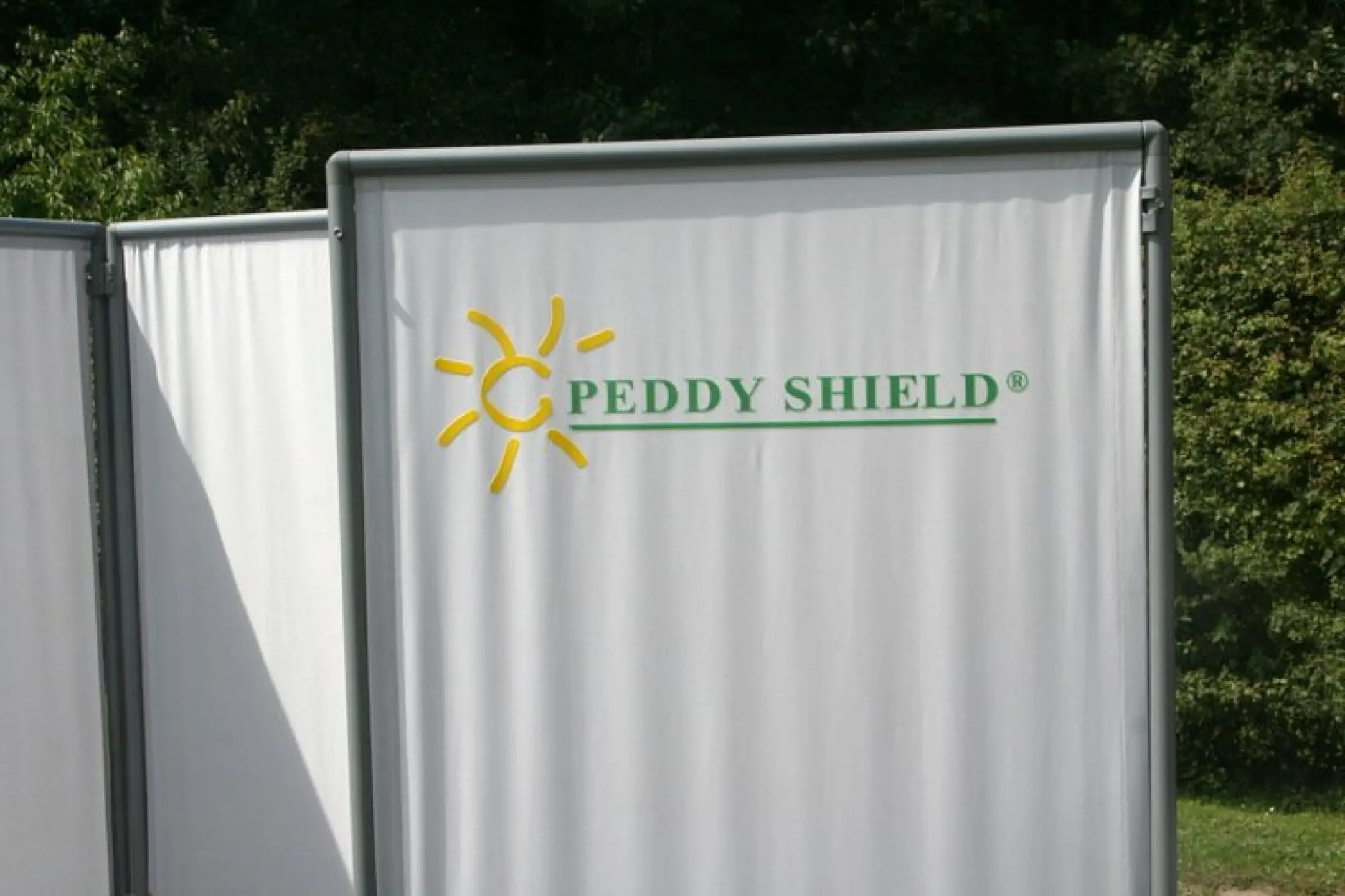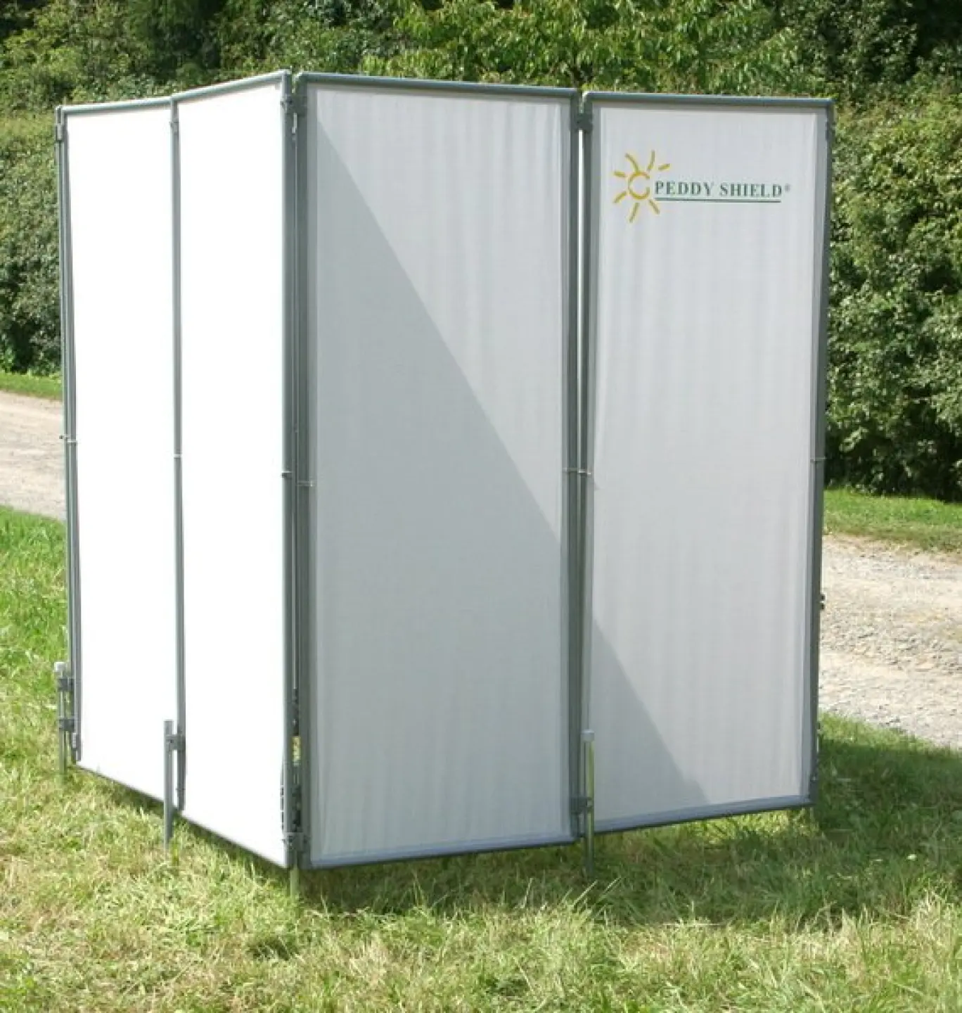 2. zusammenfaltbar - alle 3 Rahmen liegen flach an die Wand geklappt, ohne viel Platz weg zu nehmen (möglich ist auch eine freie Aufstellung mit weiteren 2x Rahmen an der Rückseite der Kabine) Patent Peddy Shield