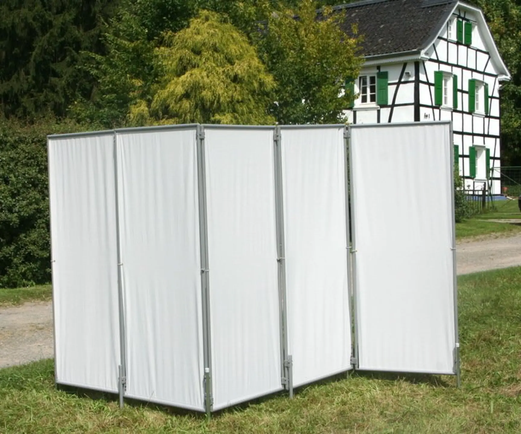 Mobiler, faltbarer Paravent in Stecktechnik als Umkleidekabine auch auf Rasen und mit angestecktem Klapptisch