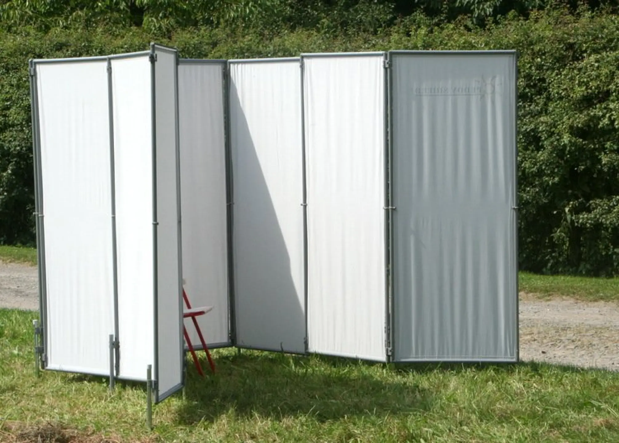 Umkleidekabine schnell aufgebaut aus faltbaren leichten Stellwänden: Dem mobilen Sichtschutz Paravent bzw. der steckbaren spanischen Wand - überall aufstellbar.