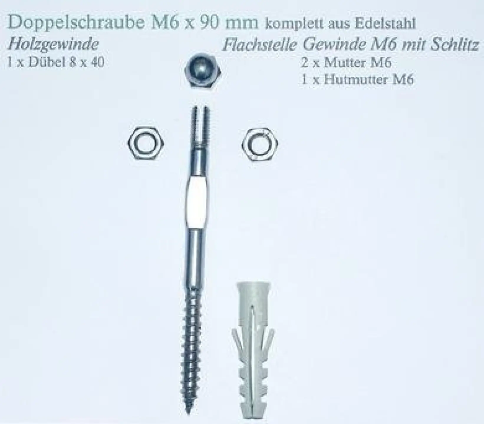 So besitzt die Doppelschraube, die so heißt,, weil sie unten Holzgewinde und oben M6 Maschinengewinde trägt, zwei Besonderheiten: