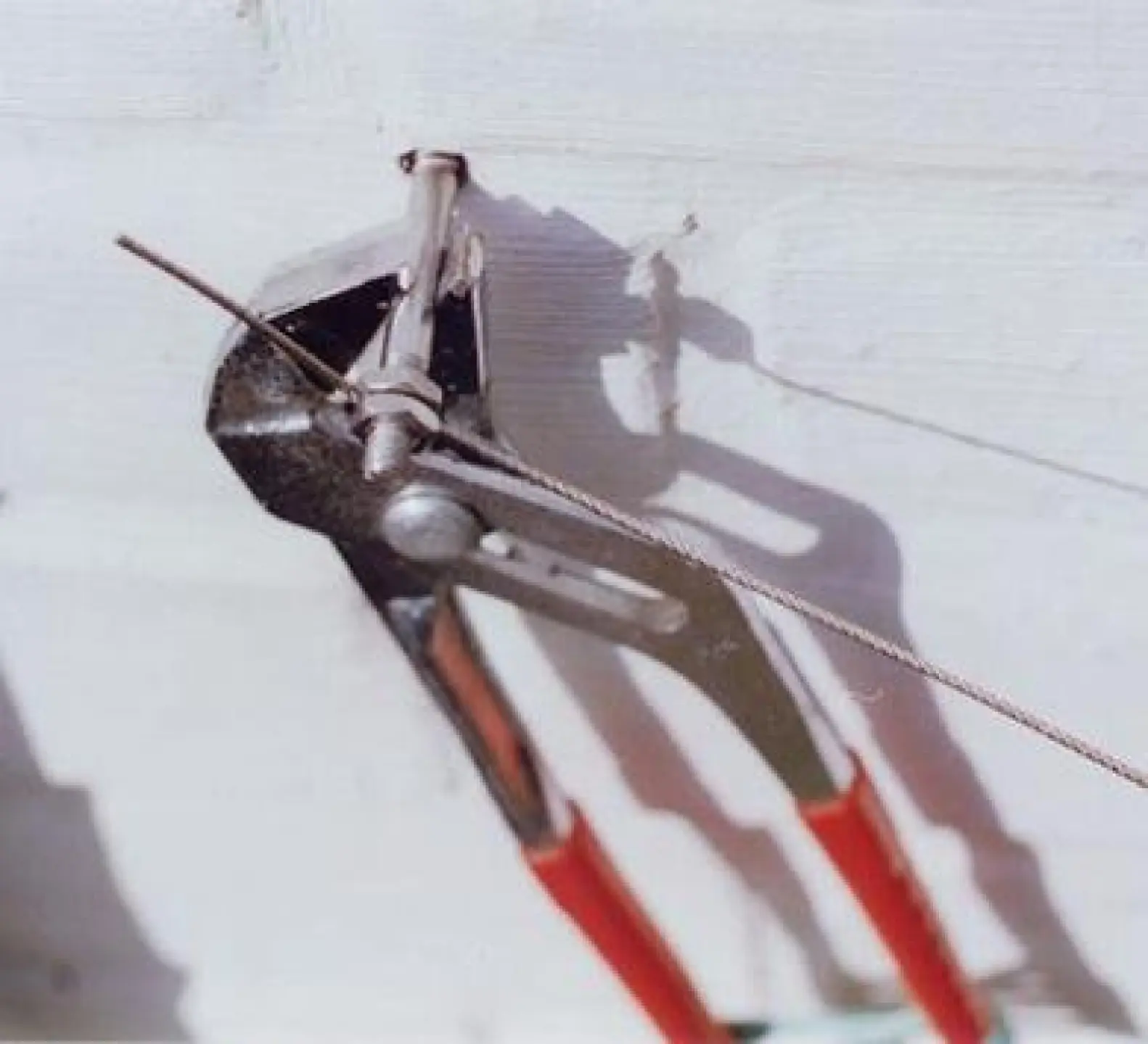 Zwischen den zwei Flachmuttern wird ein Ende eines Edelstahllseiles geklemmt - bitte nie unter der unteren Flachmutter. Die scharfe Schnittkante von dem Schlitz im Kopf der Doppelschraube Peddy Shield kann das Edelstahlseil erheblich anschneiden und unbrauchbar machen. Das Edelsrtahlseil wird immer nur geklemmt - es verformt sich, aber keiner der Einzeldrähe wird verletzt.