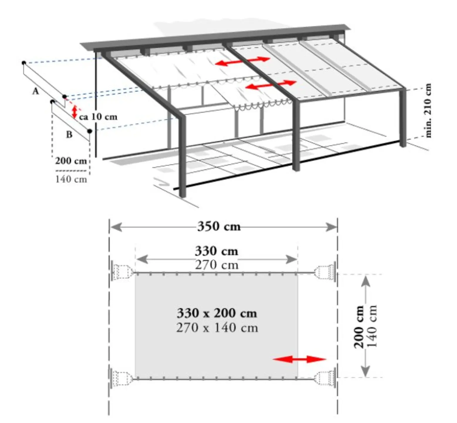 Sonnensegel 330 x 200 cm: 2x 200 cm in der Tiefe ergibt mit der Überlappung von ca. 5 - 10 cm ca. 380 - 390 cm in der Tiefe - Seilspannung möglichst nicht über 4 m - sonst in der Mitte das Edelstahlseil mit der Punktbefestigung unterstützen