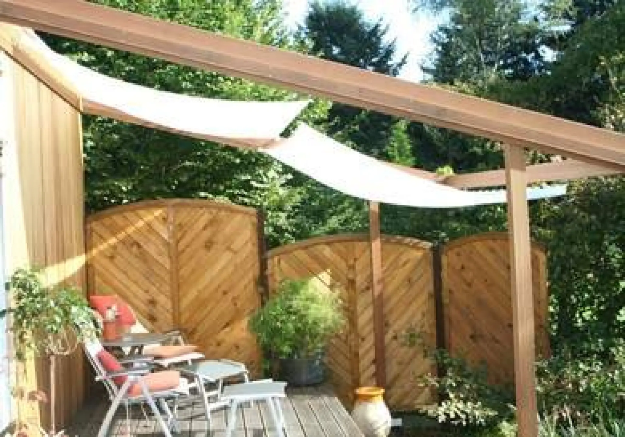 Beschattung großer Terrassenflächen mit einer stabilen an die Hauswand anlehnenden Holzrahmenkonstruktion und mehreren Seilspann-Sonnensegeln (Schiebesegel)