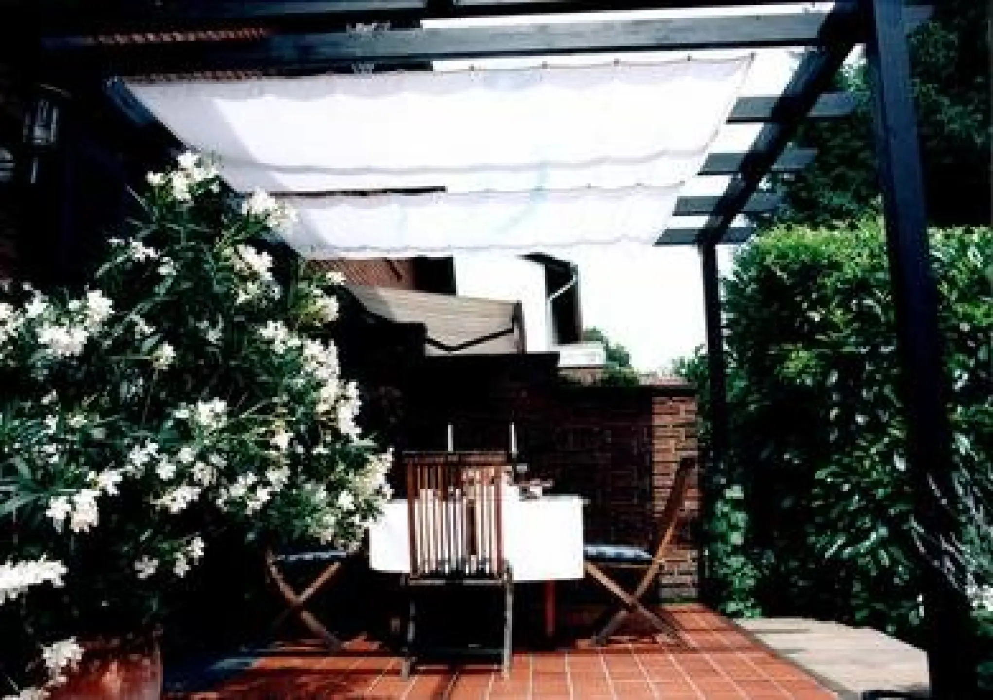 - bei vorhandener Pergola achten Sie bitte darauf, die Segel auf keinen Fall (!) horizontal zu spannen - das gibt bei Regen Wassersäcke - bereits eine geringe Schräge des Segels kann verhindern, daß sich in den Falten des "geparkten" Segels Wasser sammeln kann.