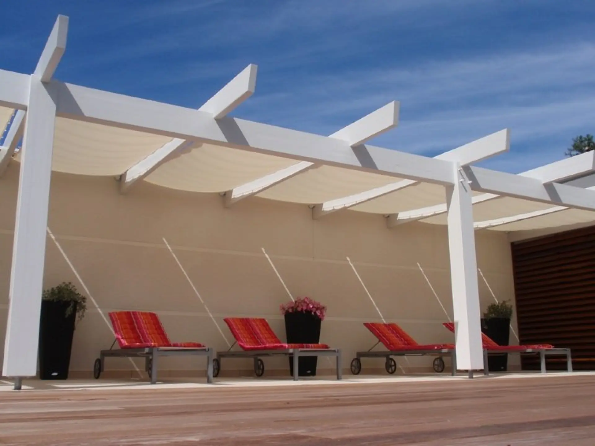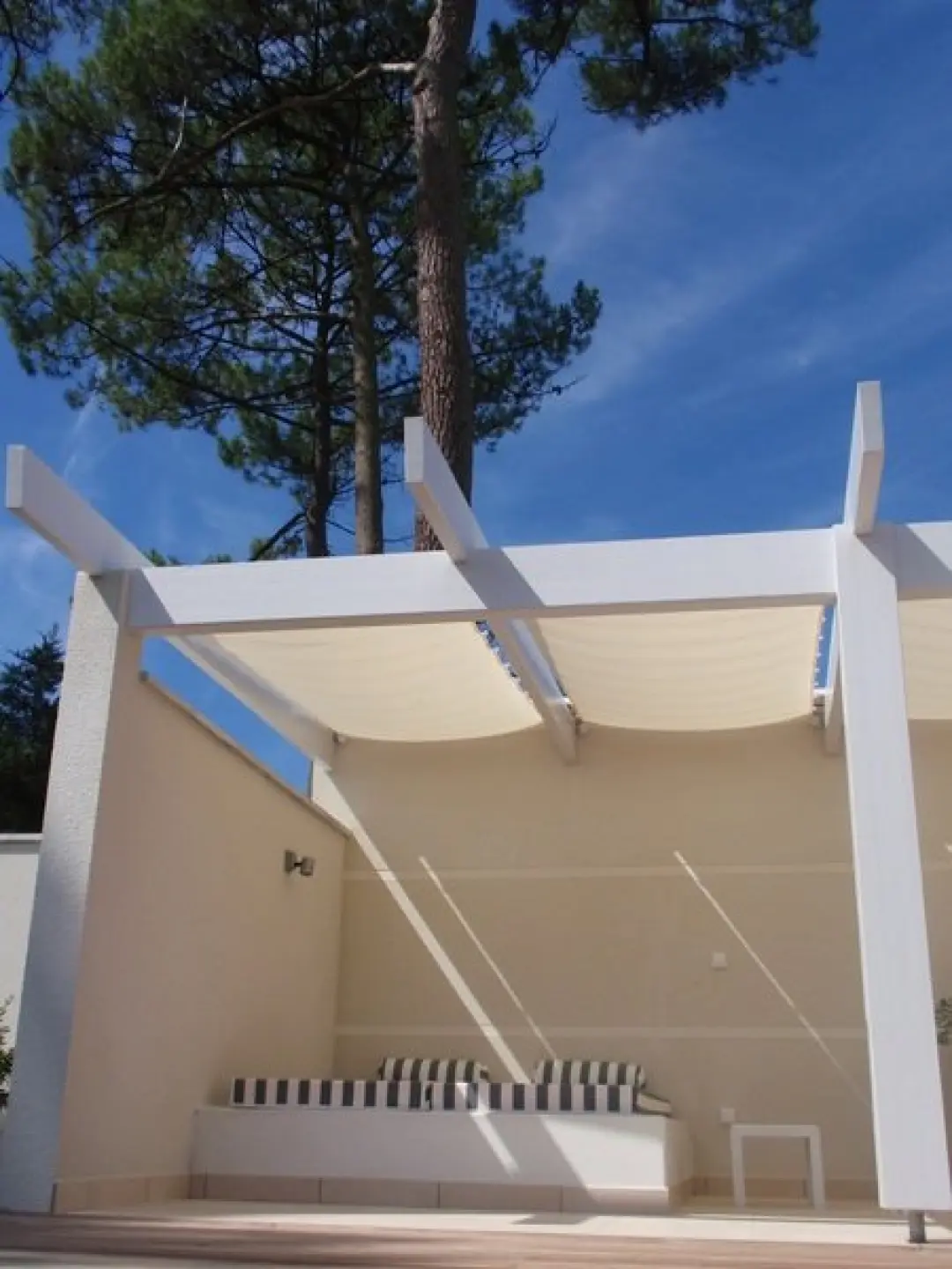 - Unterkonstruktion Pergola in Holz für einen kompletten Sonnenschutz mit Sonnensegeln in Seilspanntechnik