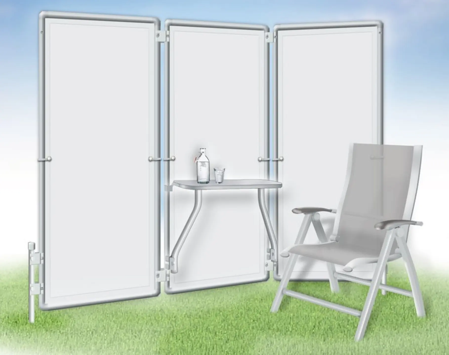 - der Klapptisch ergänzt den Sichtschutz und auch die Umkleidekabine mit einer praktischen Abstellmöglichkeit ohne, daß Sie einen zusätzlichen Tisch in den Garten tragen müssen - dieser Klapptisch ist extrem leicht, stabil und wetterfest -der Klapptisch läßt sich auch mit den Paravent-Rahmen zusammen falten - Edelstahlparavent am Schwimmbad im Garten wetterfest als Sichtschutz und Windschutz