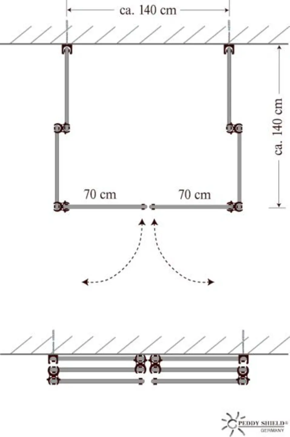 - Umkleide an eine feste Wand montieren mit den Wandhaltern oder Wand-Clips: 2x Wand-Clips im Abstand von ca. 140 cm (2x die Paravent Rahmenbreite)